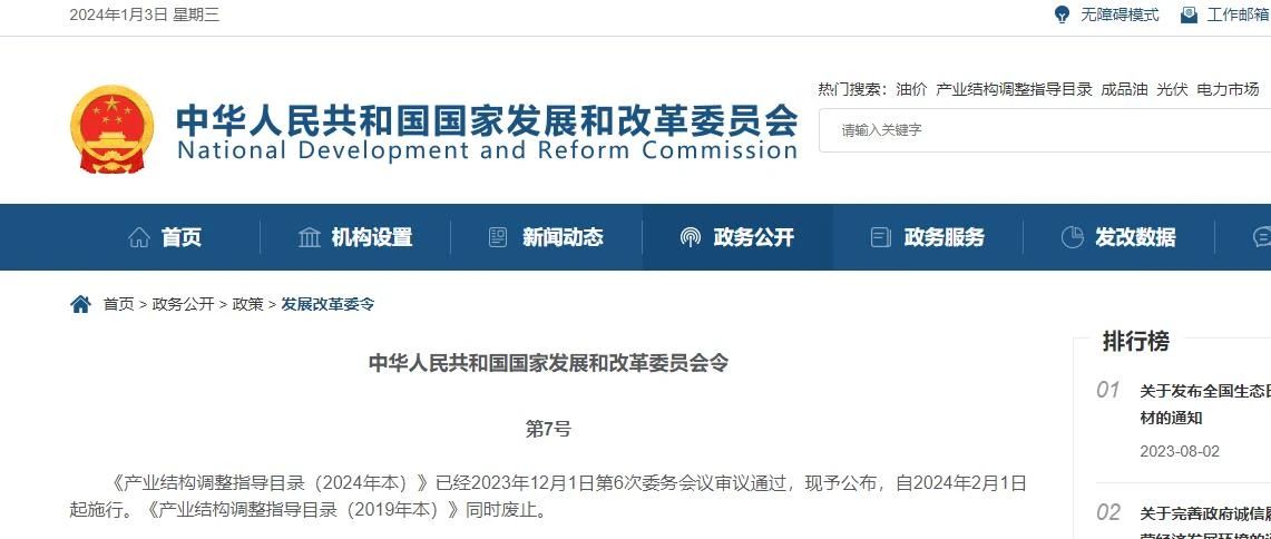 國(guó)家發(fā)展和改革委員會(huì)發(fā)布《產(chǎn)業(yè)結(jié)構(gòu)調(diào)整指導(dǎo)目錄(2024年本)》!吨笇(dǎo)目錄》由鼓勵(lì)、限制和淘汰三類(lèi)目錄組成。《指導(dǎo)目錄》自2024年2月1日起施行。