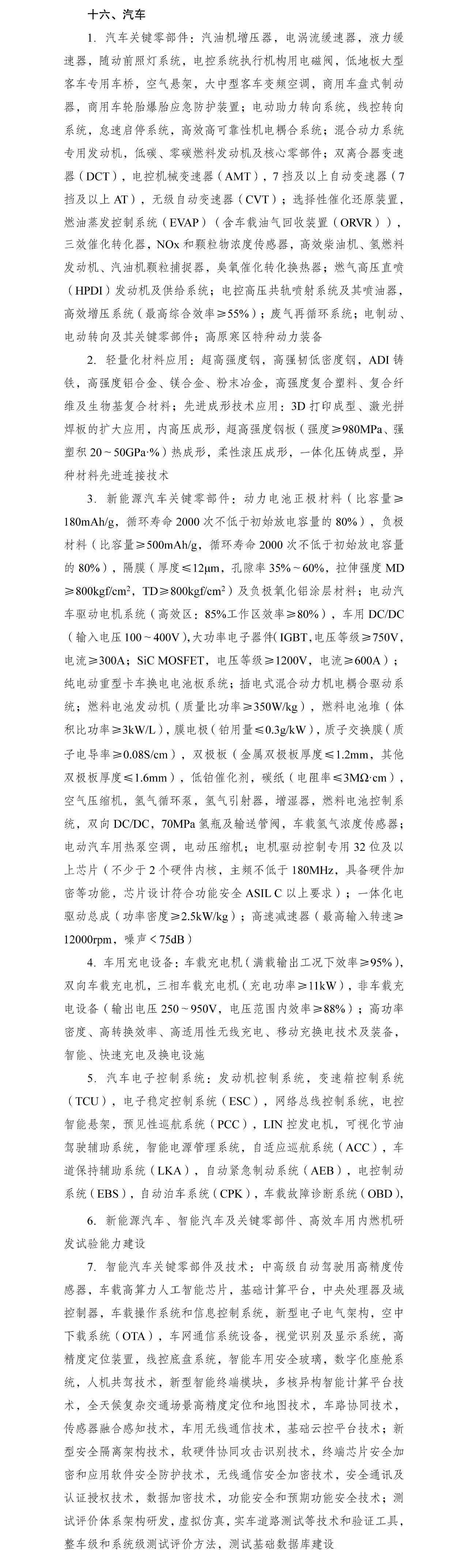 1.汽車(chē)關(guān)鍵零部件:汽油機(jī)增壓器,電渦流緩速器,液力緩速器,隨動(dòng)前照燈系統(tǒng),電控系統(tǒng)執(zhí)行機(jī)構(gòu)用電磁閥,低地板大型客車(chē)專(zhuān)用車(chē)橋,空氣懸架,大中型客車(chē)變頻空調(diào),商用車(chē)盤(pán)式制動(dòng)器,商用車(chē)輪胎爆胎應(yīng)急防護(hù)裝置;電動(dòng)助力轉(zhuǎn)向系統(tǒng),線控轉(zhuǎn)向系統(tǒng),怠速啟停系統(tǒng),高效高可靠性機(jī)電耦合系統(tǒng);混合動(dòng)力系統(tǒng)專(zhuān)用發(fā)動(dòng)機(jī),低碳、零碳燃料發(fā)動(dòng)機(jī)及核心零部件;雙離合器變速器(DCT),電控機(jī)械變速器(AMT),7擋及以上自動(dòng)變速器(7擋及以上AT),無(wú)級(jí)自動(dòng)變速器(CVT);選擇性催化還原裝置,燃油蒸發(fā)控制系統(tǒng)(EVAP)(含車(chē)載油氣回收裝置(ORVR)),三效催化轉(zhuǎn)化器,NOx和顆粒物濃度傳感器,高效柴油機(jī)、氫燃料發(fā)動(dòng)機(jī)、汽油機(jī)顆粒捕捉器,臭氧催化轉(zhuǎn)化換熱器;燃?xì)飧邏褐眹姡℉PDI)發(fā)動(dòng)機(jī)及供給系統(tǒng);電控高壓共軌噴射系統(tǒng)及其噴油器,高效增壓系統(tǒng)(最高綜合效率≥55%);廢氣再循環(huán)系統(tǒng);電制動(dòng)、電動(dòng)轉(zhuǎn)向及其關(guān)鍵零部件;高原寒區(qū)特種動(dòng)力裝備