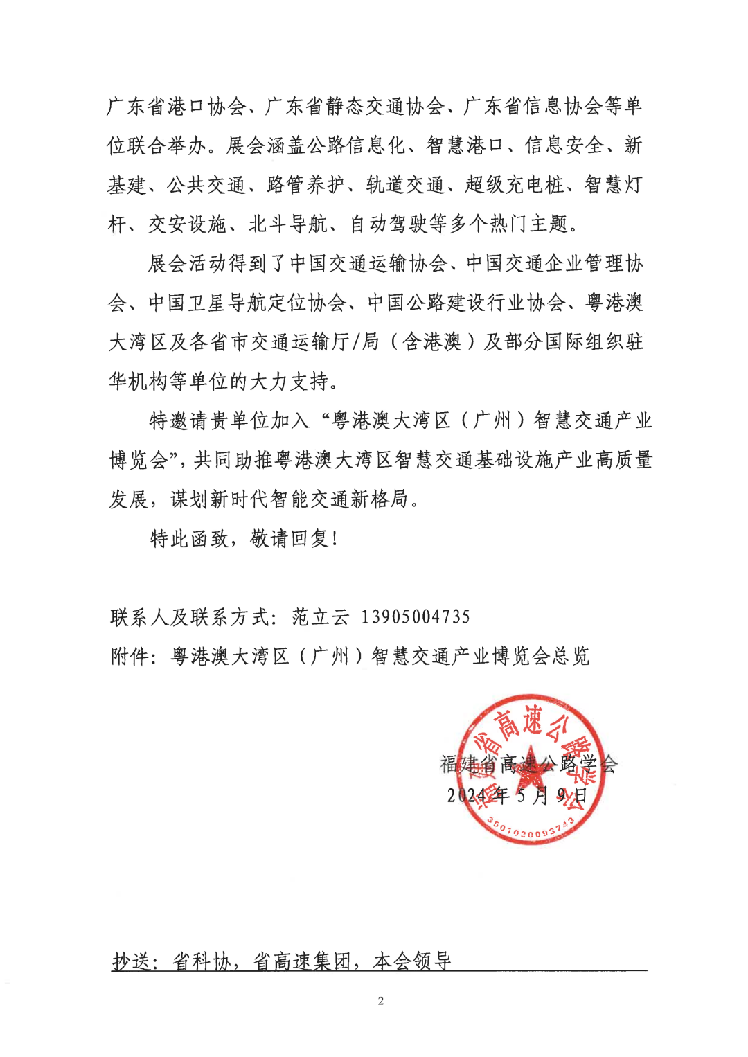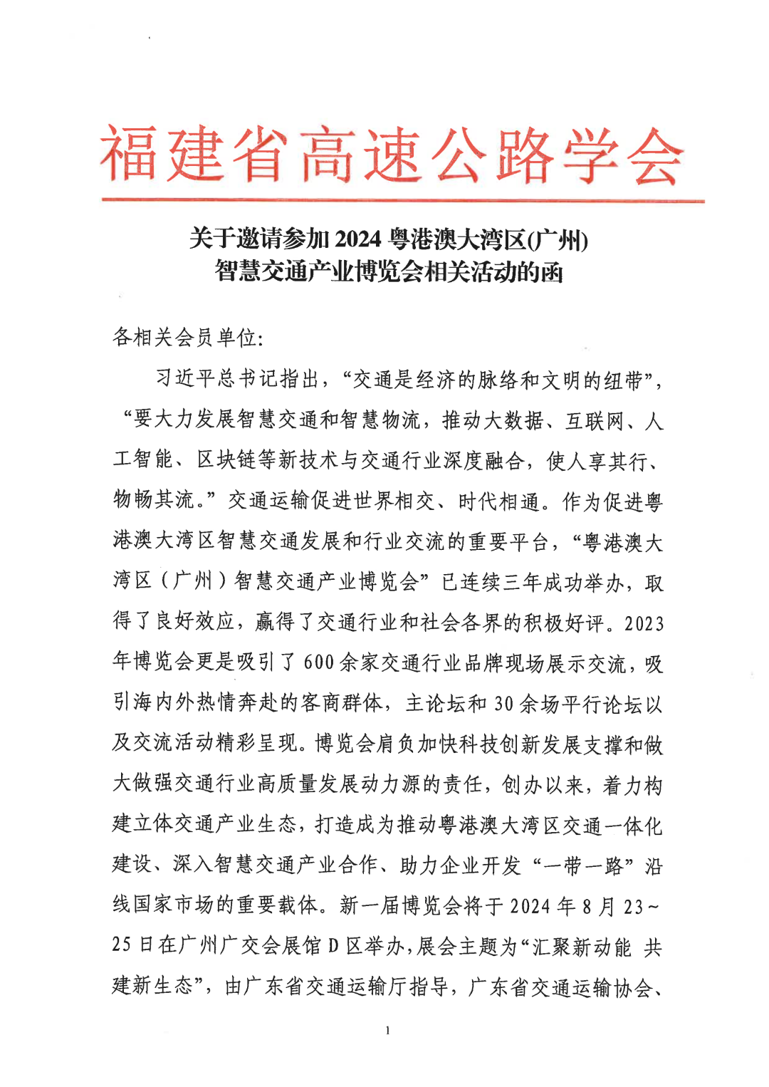 福建省高速公路學(xué)會|關(guān)于邀請參加2024粵港澳大灣區(qū)(廣州)智慧交通產(chǎn)業(yè)博覽會相關(guān)活動的函